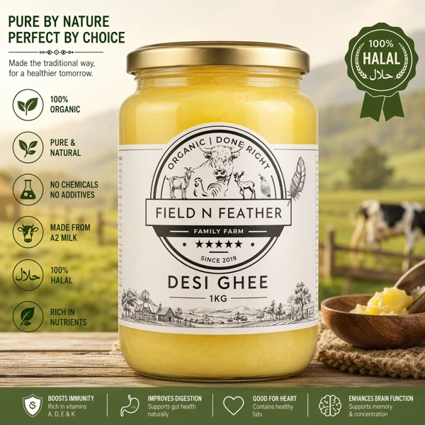 The best desi cow ghee in Pakistan comes from farms that use 100% pure cow milk and traditional hand-churning — not factory processing. Field n Feather ghee is made fresh every batch with no buffalo fat, no palm oil, and no artificial colour.